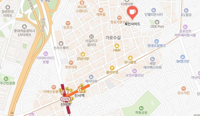 룩인사이드 갤러리는 서울 강남구 신사동 가로수길 인근 골목에 자리하고 있어요. 메인 거리에서 살짝 벗어난 위치라 번잡함은 덜하고, 조용하게 머물기 좋은 분위기를 느낄 수 있는 공간이에요. 지하철 3호선 신사역에서 도보 약 8분 정도 거리로 접근성도 무난한 편이에요.