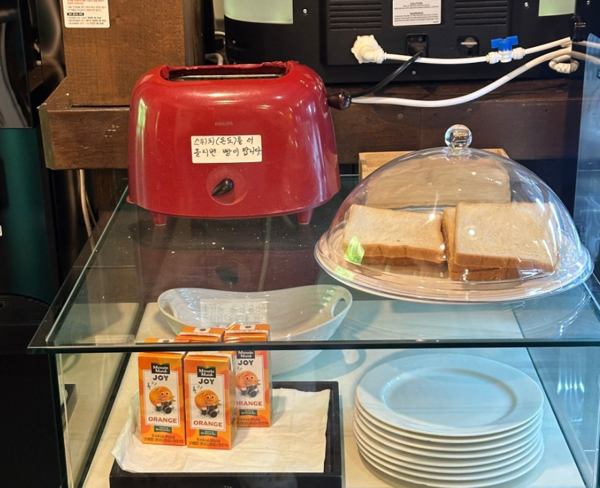 '릴리' 카페의 메뉴는 다양해요. 커피, 차, 디저트 등 여러 가지가 준비되어 있는데, 특히 추천하고 싶은 메뉴는 무료로 만들어 먹을 수 있는 토스트예요.
