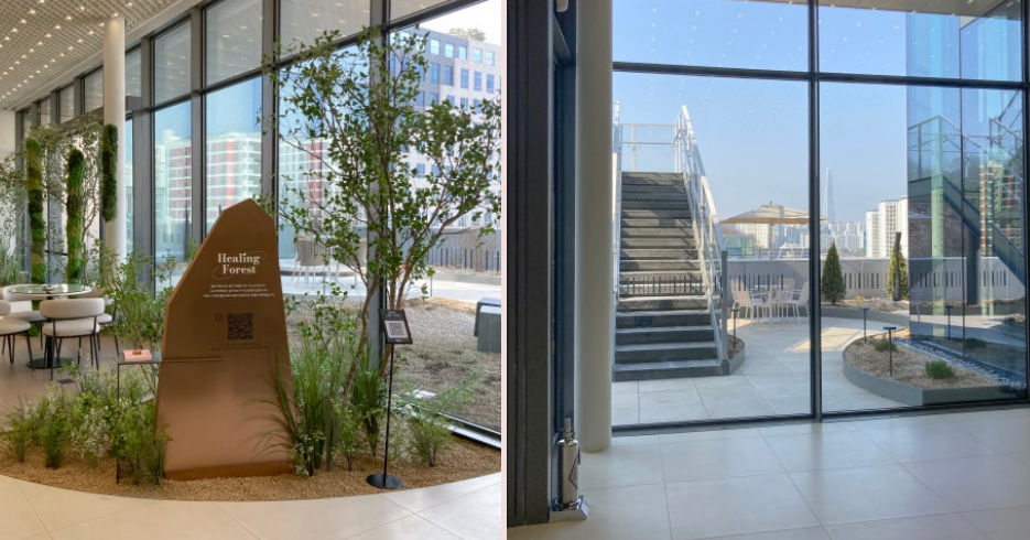 • 실내외 테마 정원 : 루프탑 야외정원, 힐링포레스트, 웰컴연못 등 다양한 테마 정원과 조경이 조성되어 있어요. 그리고,국립수목원에서 기증받은 자생식물 ‘비비추’ 20종 등 국내 야생화도 조성되어 있답니다.