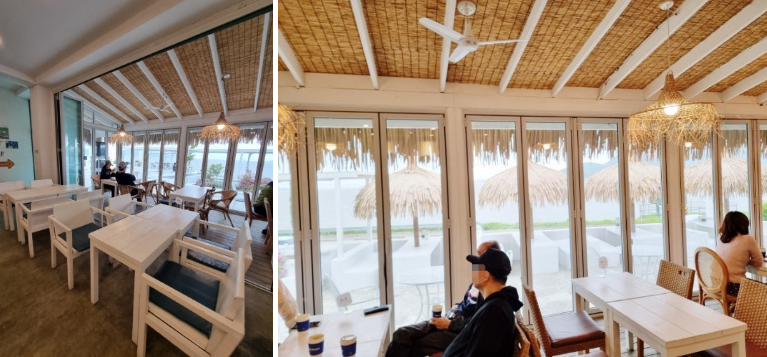 인테리어는 따뜻한 느낌의 나무 소재로 꾸며져 있어 아늑한 분위기를 자아내요. 특히, 창가 자리에 앉으면 바다와 하늘이 어우러진 멋진 경치를 감상할 수 있어요.