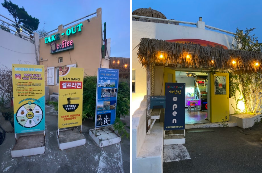 1층에는 메인 카페와 게임장이 있어 친구들과 함께 오락을 즐기기에도 좋고, 2층에서는 일몰을 감상할 수 있는 대형 창이 있어요.