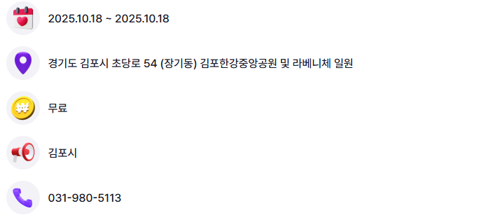2025년 김포 라베니체 축제는 오는 10월 18일(토) 하루 동안 진행될 예정이에요. 축제는 김포한강중앙공원 및 라베니체 일원에서 열리며, 다양한 프로그램과 볼거리가 가득할 거예요. 운영 시간은 오전 10시부터 저녁 10시까지로, 하루 종일 즐길 수 있는 축제예요.