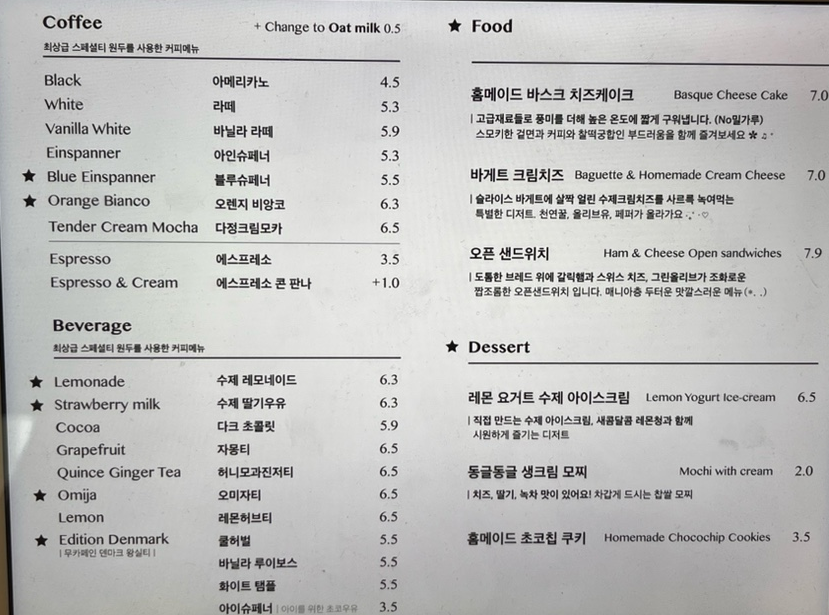 커피 맛에 집중한 메뉴들이며, 카페 공간 자체가 하나의 콘텐츠처럼 느껴지는 곳이라 메뉴보다는 공간 경험을 즐기기 위해 방문하는 사람들이 많은 곳입니다.