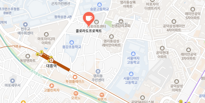 콜로라도 프로젝트는 서울 마포구 대흥동 골목에 자리하고 있어요. 그리고, 대중교통으로 방문하기도 비교적 편한 위치예요.