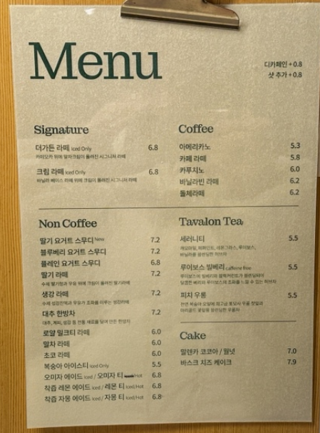더가드너의 메뉴는 다양하고 맛있어요. 특히 추천하고 싶은 음료는 따뜻한 아메리카노와 더가든라테예요.