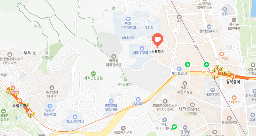 스태픽스는 경복궁역에서 도보로 약 10분 거리에 위치해 있어요. 주변은 조용한 골목길로 둘러싸여 있어, 도심의 소음에서 벗어나기 딱 좋은 장소랍니다.