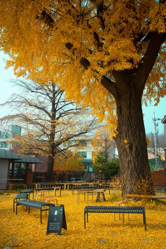 외부 정원은 특히 인상적이에요. 큰 은행나무 아래에서 자연을 느끼며 커피를 즐길 수 있는 공간은 정말 특별하죠.