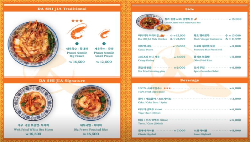 따시지아의 메뉴는 정말 다양해요. 이곳은 싱가포르의 대표적인 요리인 새우국수와 칠리 클램, 꿔바로우 등 다양한 메뉴를 맛볼 수 있고,