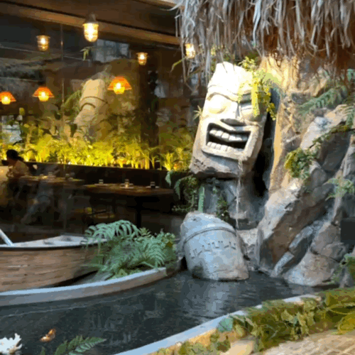레스토랑 내부는 식물과 자연 요소로 가득 차 있어, 마치 정글 속에 있는 듯한 느낌을 줘요.