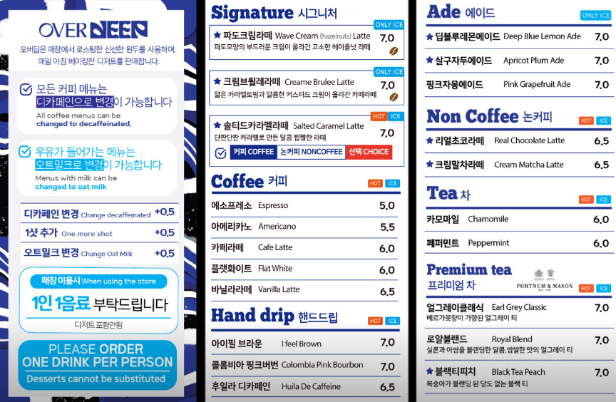 서울 마포 한복판에서 푸른 바다를 마주한 듯한 감성을 느낄 수 있는 카페가 있어요. 바로 ‘오버딥’. 이곳은 이름처럼 깊고 짙은 바다의 분위기를 그대로 담아낸 공간으로, 특히 시그니처 메뉴인 ‘파도크림라테’로 많은 사람들의 발길을 끌고 있는 곳이에요.