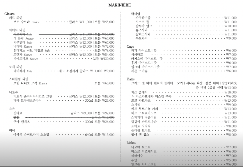 마리니에르는 카페와 바의 경계를 넘나드는 메뉴 구성이 특징이에요. 낮에는 커피, 티, 수제 디저트와 브런치 메뉴를, 밤에는 와인과 안주류를 즐길 수 있어 방문 시간대에 따라 분위기가 확 달라진답니다. 특히, 일본식 양식과 스몰 디쉬, 커피, 와인, 칵테일 등 다양한 메뉴를 제공하는 카페바의 성격이 강해요.