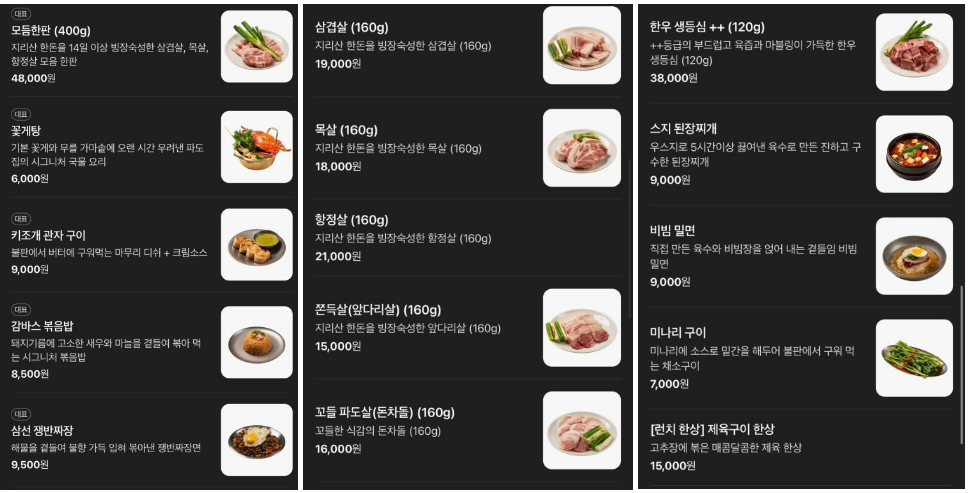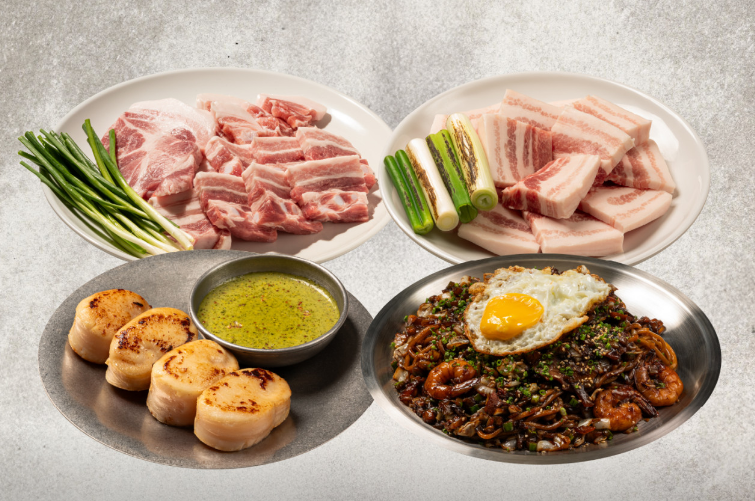 • 돼지고기 숯불구이 세트: 두툼하게 썰린 한돈 돼지고기와 세트별로 소맥세트, 꼬막무침 등을 함께 먹을 수 있는 스타일이 특징이에요.