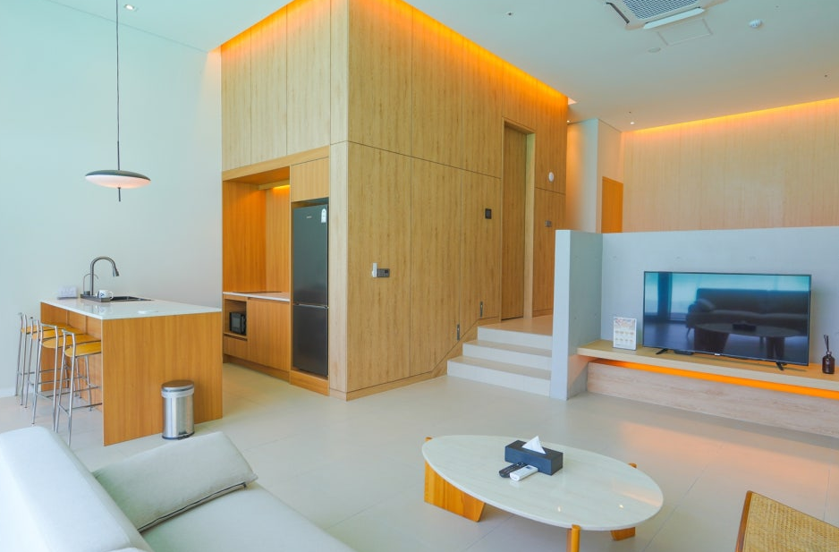 객실 내부는 깔끔하고 현대적인 인테리어로 꾸며져 있어 편안하게 쉴 수 있었어요. 또한, 취사가 가능해서 간단한 요리도 할 수 있었답니다.