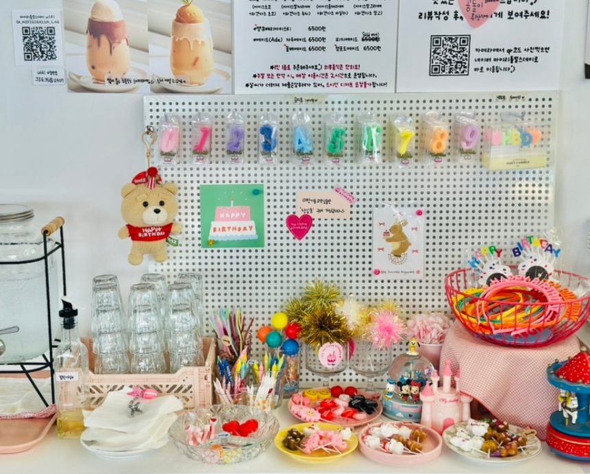 카페에 들어서면 가장 먼저 눈에 띄는 것은 따뜻하고 사랑스러운 분위기의 인테리어예요. 파스텔톤 색감과 귀여운 소품들이 곳곳에 배치되어 있어 마치 작은 생일 파티 공간에 온 듯한 느낌을 주는 곳입니다.
