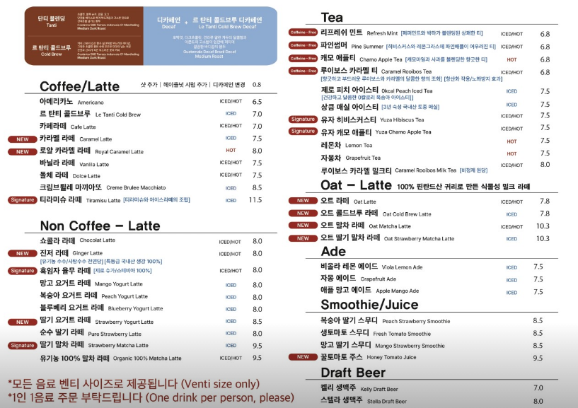 에스프레소 기반의 기본 커피 메뉴는 물론, 라테류와 시그니처 음료까지 다양하게 준비되어 있어서 취향에 맞게 선택하기 좋아요. 특히 대형 카페답게 논커피 음료와 디저트 라인업도 탄탄하게 준비되어 있답니다.