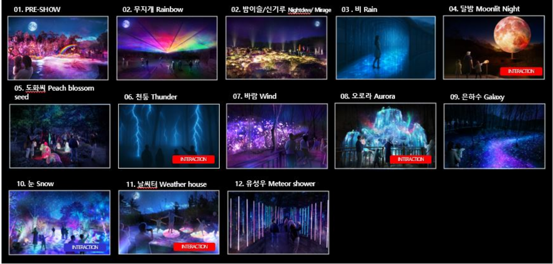 이곳의 가장 큰 매력은 다양한 테마의 조명과 미디어 아트 전시예요. 매일 밤마다 다른 테마로 꾸며지기 때문에 매번 방문해도 새로운 느낌을 받을 수 있어요.