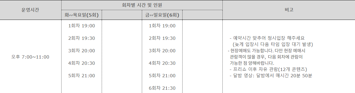 이곳의 가장 큰 매력은 다양한 테마의 조명과 미디어 아트 전시예요. 매일 밤마다 다른 테마로 꾸며지기 때문에 매번 방문해도 새로운 느낌을 받을 수 있어요.