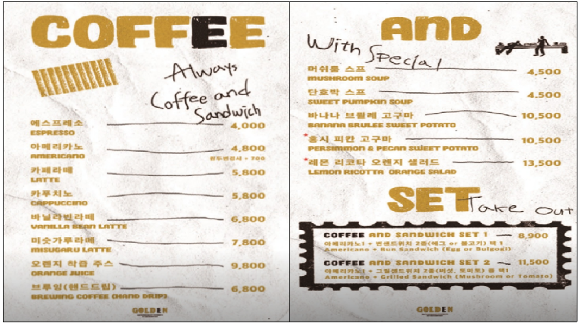 골덴은 브런치 메뉴와 음료를 중심으로 다양하게 구성되어 있고 계절 감성을 반영하는 메뉴가 많아요.