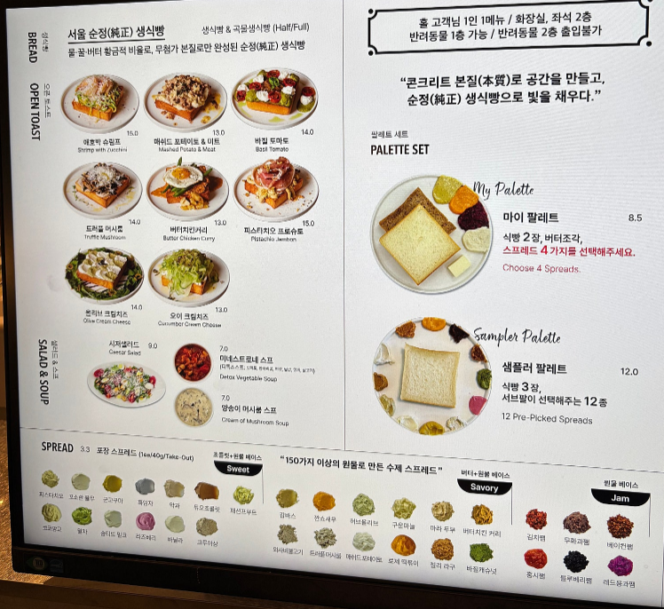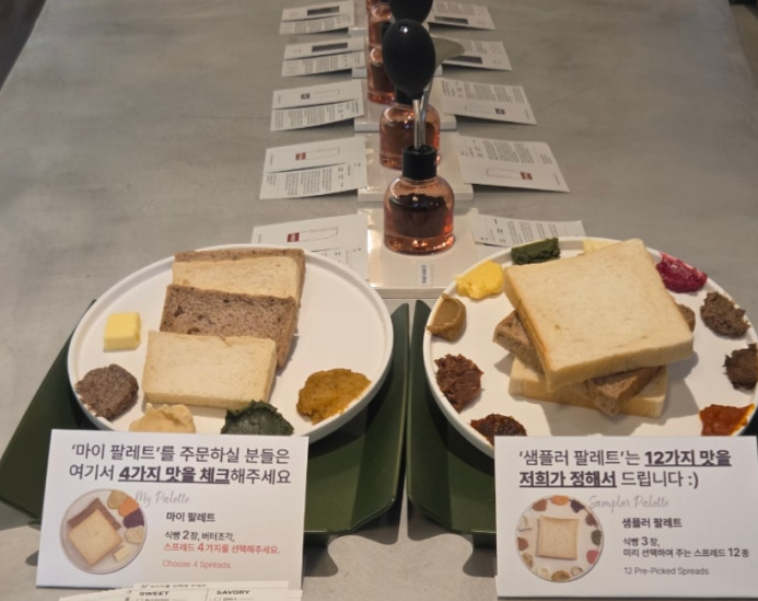 브레드 팔레트의 메뉴는 정말 다양해요. 기본적인 생식빵 외에도 여러 가지 스프레드와 토핑을 선택할 수 있어요.