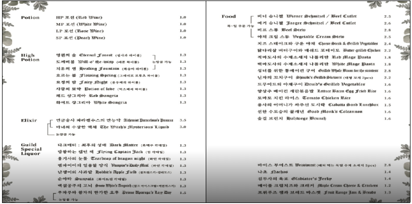특히, 이곳의 음료와 음식은 판타지 콘셉트에 충실한 공간 디자인과 함께 포션, 성녀를 위한 통베이컨 등 창의적인 메뉴명이 흥미롭습니다.