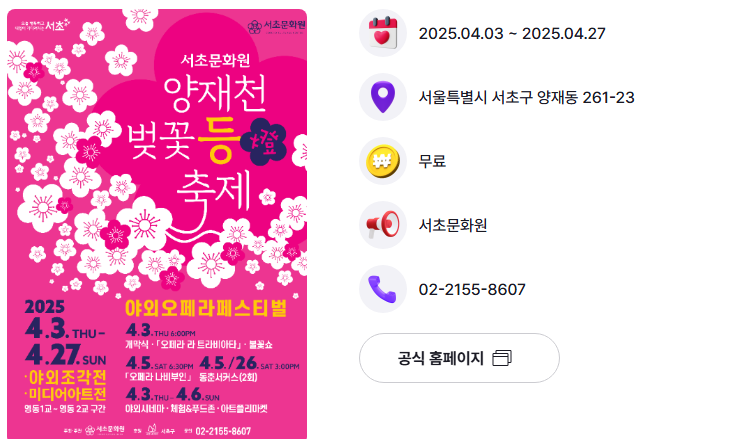 2018년에 시작된 '양재천 벚꽃 등 축제'는 올해로 7회째를 맞이하는 서울 대표 벚꽃 축제 중 하나입니다. 올해 축제는 4월 3일 오후 6시 개막식을 시작으로 4월 27일까지 진행돼요. 또한 축제기간 동안에는 남녀노소 누구나 즐길 수 있는 풍성한 프로그램이 마련되어 있답니다. 동춘서커스, 버블판타지아 등 특별 공연도 진행되고, 아트플리마켓, 야외시네마 등 다양한 체험 프로그램도 참여할 수 있어요. 이 축제의 특별한 관람 포인트는 해가 진 후에도 양재천을 환하게 밝혀주는 '벚꽃로드'랍니다.