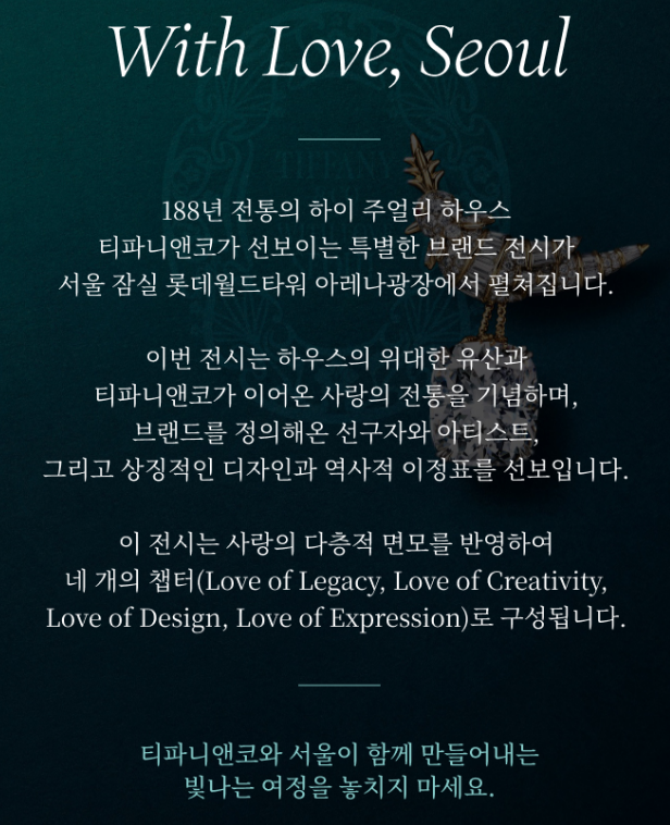 안녕하세요! 오늘은 잠실에서 열리는 특별한 티파니앤코의 팝업 전시, 'With Love, Seoul'에 대해 자세히 알아보려고 해요. 이 전시는 티파니앤코의 188년 전통을 기념하며, 서울에서만 경험할 수 있는 특별한 이벤트랍니다. 그럼 하나씩 살펴볼까요?