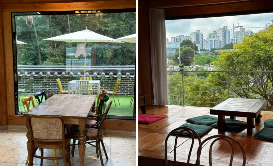 카페 내부는 넓고 쾌적하며, 자연 채광이 잘 들어오는 구조로 되어 있어요. 한옥의 전통적인 요소와 유럽풍의 세련된 인테리어가 조화를 이루어, 마치 다른 나라에 온 듯한 기분을 느낄 수 있어요.