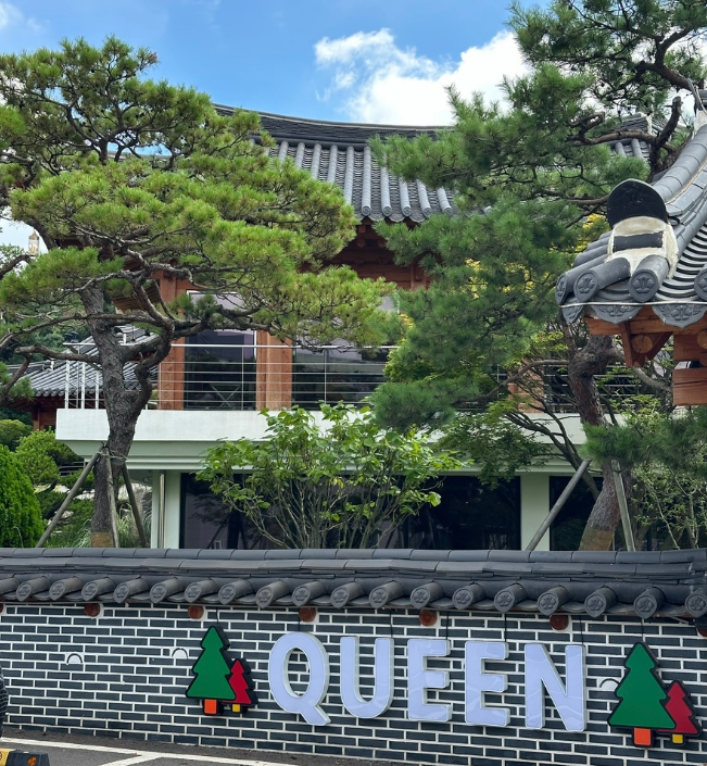 더포레스트 퀸은 한옥과 유럽풍 건물이 조화를 이루는 대형 카페로, 넓은 공간과 아름다운 경관이 특징이에요.