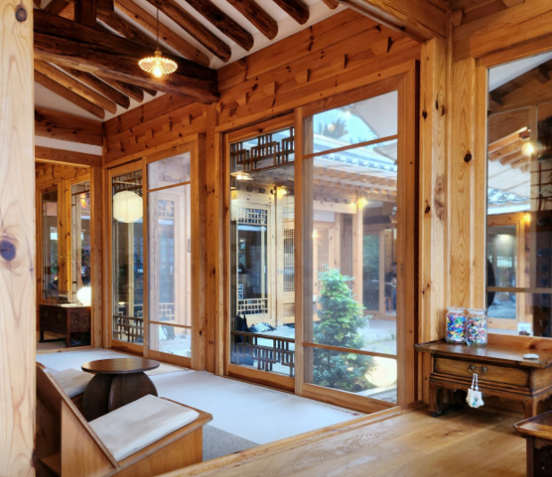 - 따뜻한 나무 질감이 살아있는 전통 한옥 구조