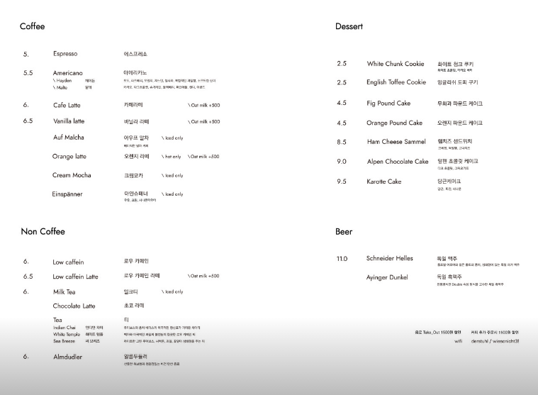 데스툴 연희는 당근케이크와 알펜 초콜릿케이크 등 다양한 디저트 메뉴와 함께 커피, 논커피 음료, 독일 맥주까지 선택의 폭이 넓어요. 커피를 마시는 것 자체가 하나의 ‘디자인 경험’처럼 느껴지는 곳이에요.
