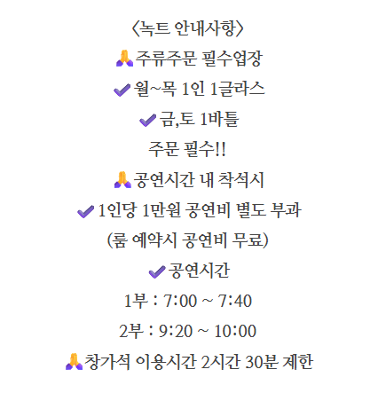 녹트는 예약이 필수예요. 특히 주말에는 많은 사람들이 방문하기 때문에 미리 예약하는 것이 좋아요. 운영 시간은 평일과 주말에 따라 다르니, 방문 전에 확인해 보는 것이 좋답니다. 매일 2회의 재즈공연이 있고, 공연비가 별도로 10,000원 부과되니 참고하세요!