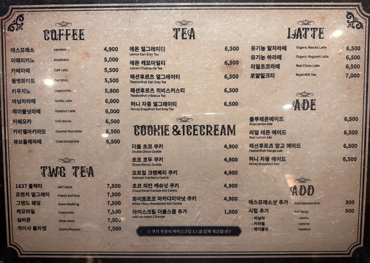 - 아메리카노 / 카페라테 : 기본 커피 메뉴지만 잔과 플레이팅이 영화 속 스타일처럼 제공돼 더욱 감성적입니다.