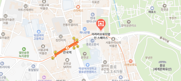 아라리오 뮤지엄 인 스페이스는 안국역 도보 이동이 가능한 위치에 있고, 북촌 한옥마을 초입에 자리하고 있어 전시 관람 전후로 산책 코스를 함께 즐기기 좋은 곳에 자리 잡고 있어요.