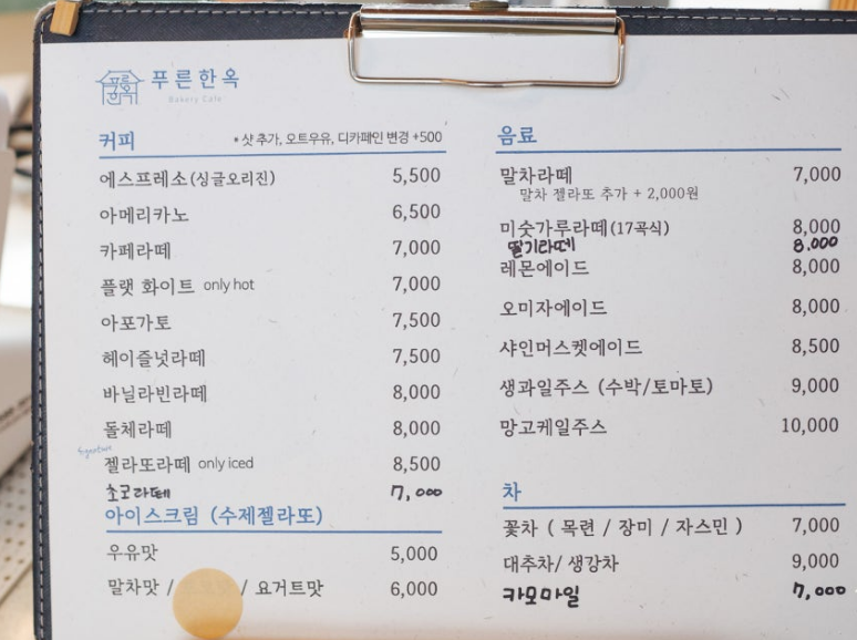 카페의 메뉴는 전통 꽃차(장미, 자스민, 목련)부터 현대적인 음료까지 다양하게 구성되어 있어요. 특히, 시그니처 음료인 '푸른한옥 라떼'는 부드러운 맛과 향이 일품이에요. 또한, 전통 디저트인 인절미와 함께 즐기면 더욱 좋답니다. 계절마다 바뀌는 특별 메뉴도 놓치지 마세요!