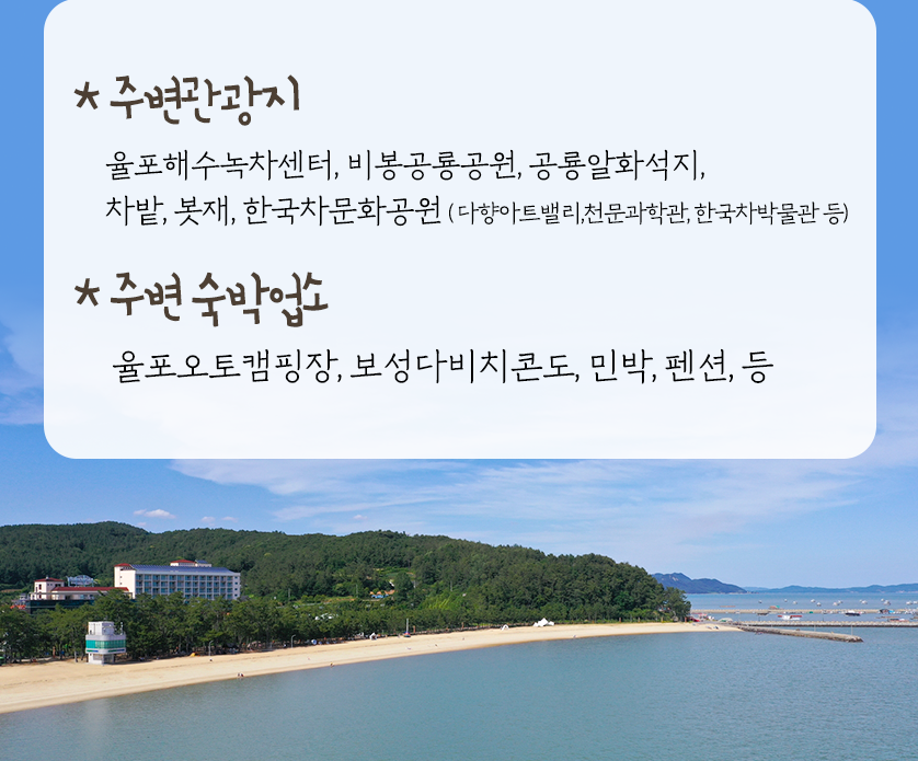 특 징 : 보성 율포해수욕장은 고운 은빛 모래와 해송의 어우러짐이 아름다운 해변으로 수심이 깊지 않아 아이들과 해수욕하기 좋은 곳이에요. 이곳은 녹차해수탕도 있어서 해수욕을 즐긴 후 힐링과 사우나를 모두 즐길 수 있답니다.