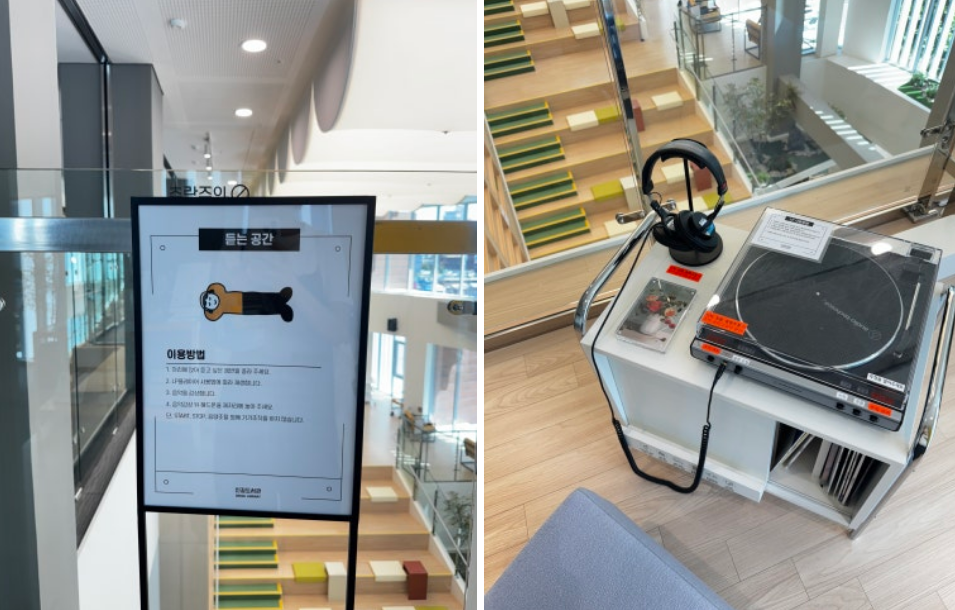 - 4층 : 필사존과 음악감상실이 있어요. 독서 후 음악을 감상하며 여유를 즐길 수 있는 공간이에요.