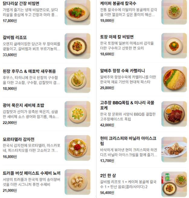 이곳의 가장 큰 강점은 생면 파스타예요. 직접 만든 생면을 사용해 쫄깃한 식감을 느낄 수 있고, 소스가 면발에 잘 흡수되어 있어서 맛이 뛰어나요. 그리고 고추장 BBQ폭립&미나리곡물포케, 광어 묵은지 세비체 초밥, 갈비찜 리조또, 케이퍼 봉골레 칼국수 등 색다른 메뉴가 있어서 즐기기 너무 좋아요.