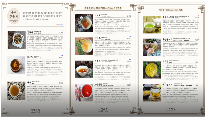 • 대추차 : 달콤하면서도 깊은 향이 진하게 우러나 겨울철 특히 인기 있는 메뉴