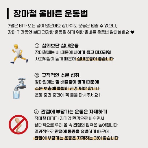 장마철에는 건강 관리가 특히 중요해요. 충분한 수분 섭취와 균형 잡힌 식단을 유지하는 것이 면역력을 높이는 데 큰 도움이 돼요. 또한, 규칙적인 운동과 충분한 수면도 잊지 말아야 해요. 건강한 식습관과 생활습관으로 장마철을 잘 이겨내길 바랄게요! 💪