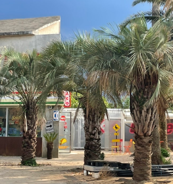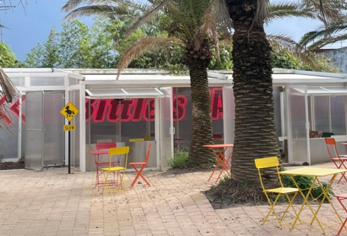 비틀스타코 애월점은 야자수, 네온사인, 테라스 좌석 등으로 꾸며진 이국적인 외관이 특징이에요.