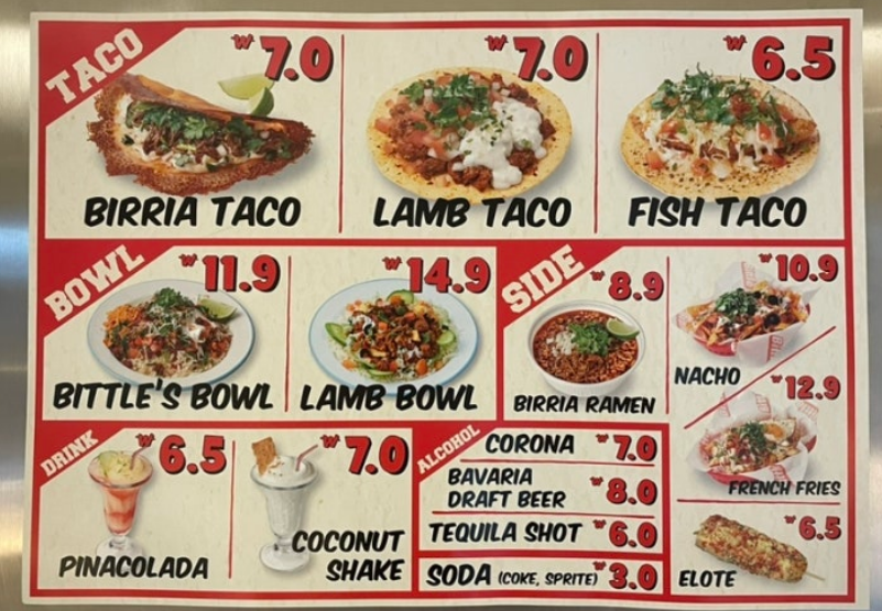• 비리아 타코 : 소고기를 부드럽게 조리한 타코로 가장 인기 메뉴
