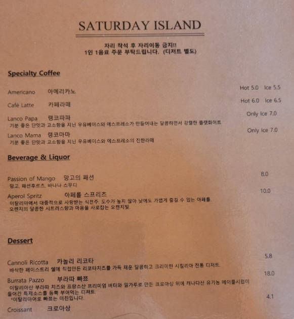 세러데이아일랜드의 메뉴는 다양해요. 특히, 신선한 재료로 만든 디저트와 커피가 인기인데요.