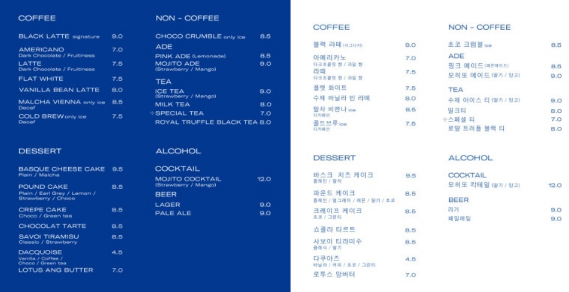 테르트르의 메뉴는 정말 다양해요. 커피, 차, 디저트 등 여러 가지가 준비되어 있어요.