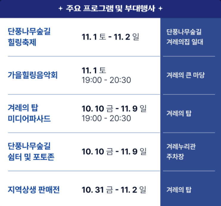 천안에 위치한 독립기념관 단풍나무숲길은 2017년 ‘제1회 단풍나무숲길힐링축제’ 개최를 통해 독립운동사 강연, 통기타 공연, 사진 촬영 등 다채로운 프로그램을 선보인 이후, 전국의 관광객들에게 독립기념관 단풍나무길을 알리게 된 곳이예요.