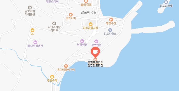 투썸플레이스 경주감포항점은 경상북도 경주시 감포읍 감포로 2길 54-3에 자리한 오션뷰 카페입니다. 감포항과 동해 바다가 어우러진 해안 도로를 지나며 찾기 좋은 위치에 있어, 경주 시내 관광(불국사, 경주역 등) 후 동해 방향 드라이브 코스로 매우 적합합니다.