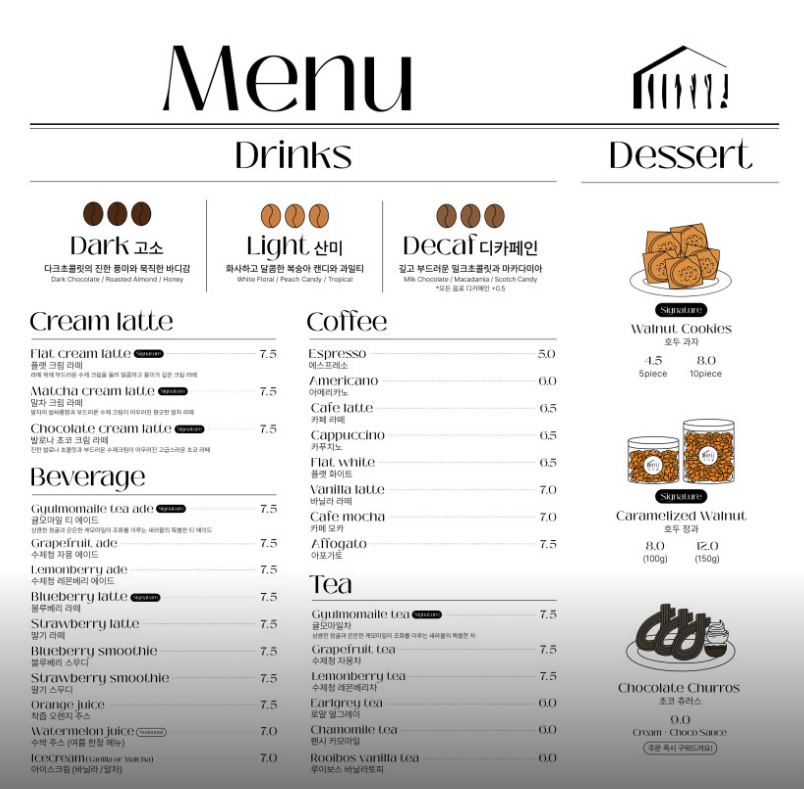 특히, 음료 주문 시 제공되는 호두정과와 시그니처 호두과자는 별미예요. 그리고, 디카페인 커피와 다양한 디저트 메뉴를 즐길 수 있어요.