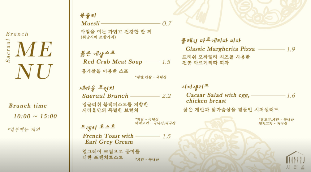서울 새라울 카페의 메뉴는 다양해요. 브런치 메뉴도 이용할 수 있어요.