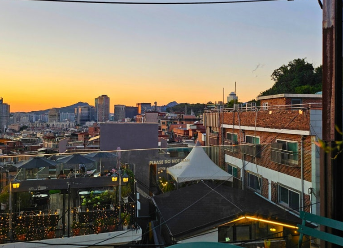 '오일'의 가장 큰 매력은 바로 루프탑이에요! 루프탑에 올라가면 해방촌의 전경과 함께 남산타워까지 한눈에 볼 수 있답니다.