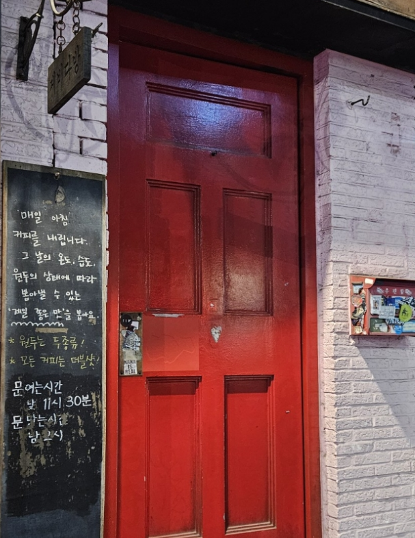 붉은 문 옆의 칠판에 당일의 공연 라인업이 적힌 모습은 마치 작은 예술 갤러리에 온 듯한 느낌을 주기도 해요.