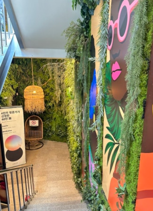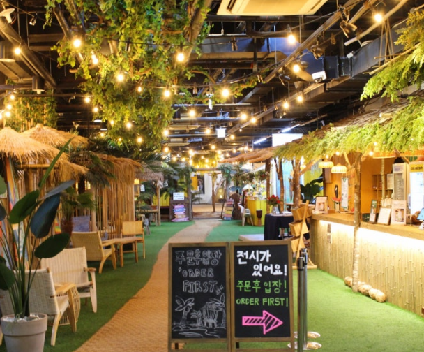 지하로 내려가는 입구부터 내부로 이어지는 공간은 이미 도심 속 작은 휴양지 같은 분위기를 자아내기 때문에, 처음 방문해도 이국적인 감성을 바로 느낄 수 있는 곳입니다.